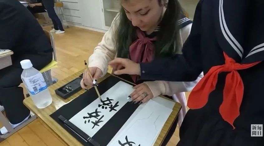 外国学生们拿起毛笔,老师会在一旁耐心地指导。
