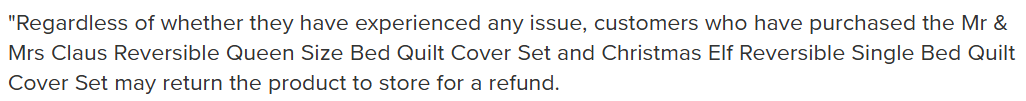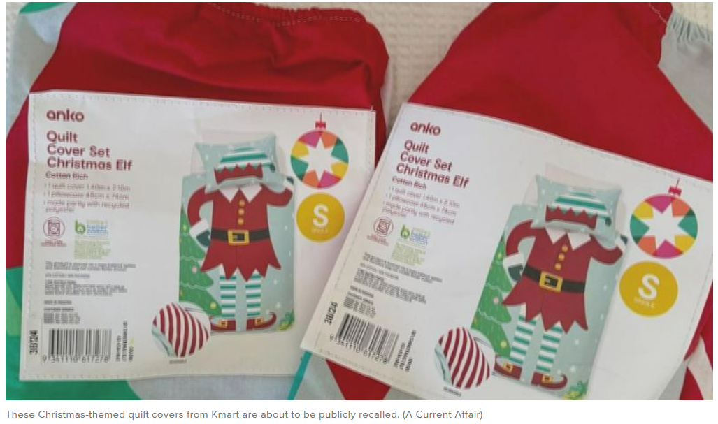 据澳媒报道,Kmart发言人表示,将很快针对“Mr & Mrs Claus Reversible Queen Size Bed Quilt Cover Set”和“Christmas Elf Reversible Single Bed Quilt Cover Set”这两款被套套装,发布正式召回通知,顾客可将相关产品退回门店获得全额退款——