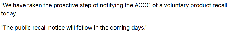我们已经主动向澳洲竞争与消费者委员会(ACCC)提交了自愿召回产品的通知,正式的公开召回通知将在未来几天内发布。”