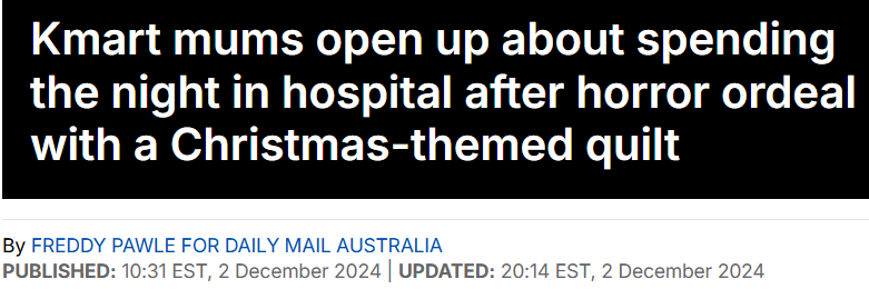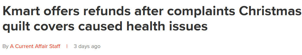在多名顾客反应使用了一系列圣诞主题床上用品引发健康问题后,本周一,Kmart宣布召回相关产品并提供退款!