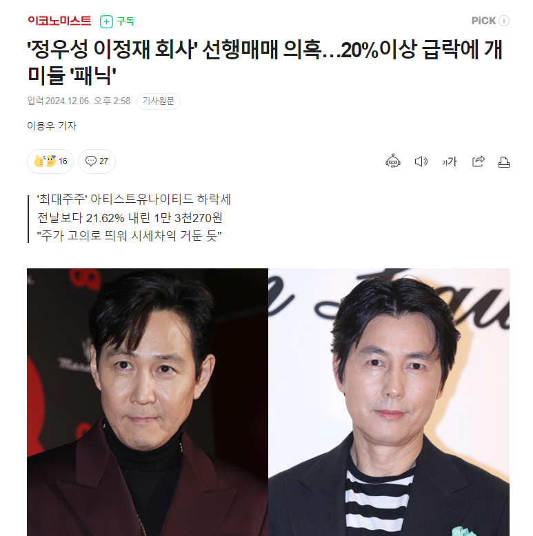当时,Wider Planet公布了190亿韩元规模的第三方分配有偿增资消息。同时,“李政宰(100亿韩元)、郑宇成(20亿韩元)、朴仁奎(20亿韩元)、Wysiwyg Studios共同代表朴冠宇(20亿韩元)、宋基哲(10亿韩元)等参与增资”、“”李政宰成为WiderPlanet最大股东”的消息在网络社区和社交媒体平台中“秘密”传开。