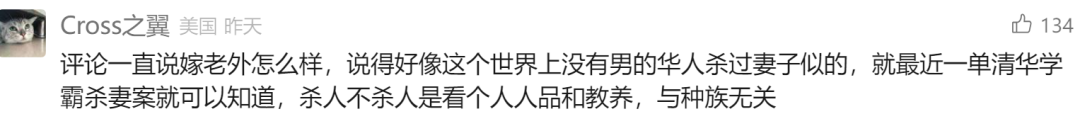 但也有网友直指,评论一直说嫁老外怎么样,说得好像这个世界上没有男的华人杀过妻子似的,就最近一单清华学霸杀妻案就可以知道,杀人不杀人是看个人人品和教养,与种族无关。