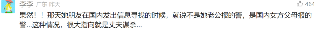 果然!!那天她朋友在国内发出信息寻找的时候,就说不是她老公报的警,是国内女方父母报的警…这种情况,很大指向就是丈夫谋杀…