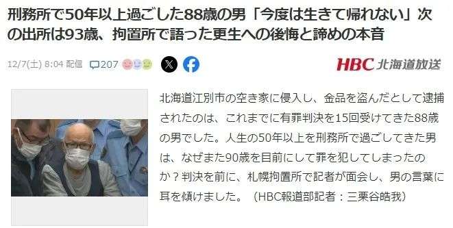 88岁的海野秀男,曾在札幌监狱服刑3次,在月形监狱服刑1次,坐牢共计超过50年。