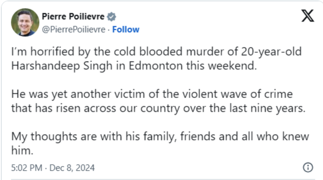 这起案件还引起了保守党领袖博励治的关注。他在社交媒体上发帖称,对这起冷血谋杀案感到震惊,并表示Singh是“过去九年间加拿大暴力犯罪浪潮的又一名受害者”。“我的思念与他的家人、朋友以及所有认识他的人同在。”