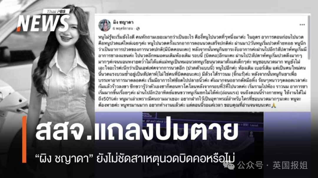 泰国这两天有个事儿闹得挺大,20岁女歌手查雅达(Ping Chayada)在乌隆府的一家泰式按摩店按摩之后身亡,搞得不少泰国人都挺焦虑。