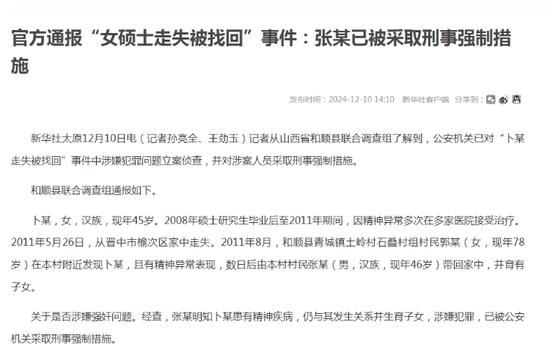 12月10日下午,新华社发布最新消息称,当地公安机关已对“卜某(众多网友叫她“花花”)走失被找回”事件中涉嫌犯罪问题立案侦查,并对涉案人员(张某)采取刑事强制措施。此前,当地警方曾通报称,卜某于2011年5月从家中走失,后被山西省晋中市和顺县青城镇居民张某收留。