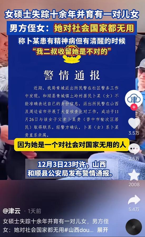 上游新闻注意到,关于是否涉嫌拐卖妇女问题,新华社最新报道中并未给出明确结论。报道称,2011年5月26日,卜某从晋中市榆次区家中走失。经走访村民,2011年7至8月间,卜某曾独自在青城镇土岭村石叠村组及周边多个村停留10余天,有精神异常表现。截至目前,尚未发现卜某被拐卖的线索和证据,公安机关仍在深入调查。