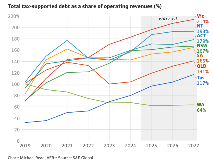 维州的情况尤为突出,到2027年,其债务将达到运营收入的214%,