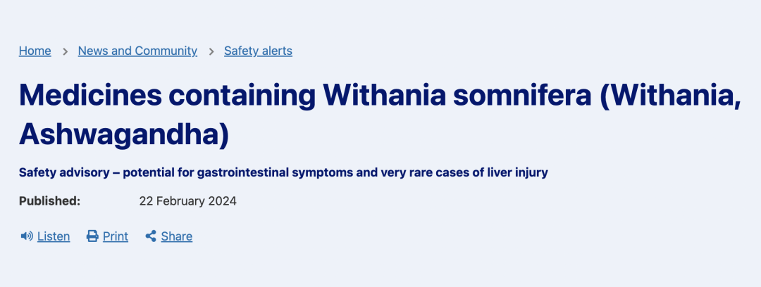 因为涵盖的种类太多,产品数量极大,所以TGA也是频频发出警告,提醒大家,如果服用保健品含有Withania somnifera这一成分,一旦感觉不适,应立即停用!