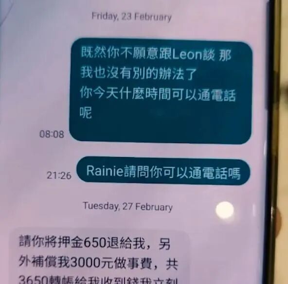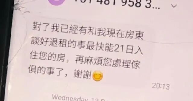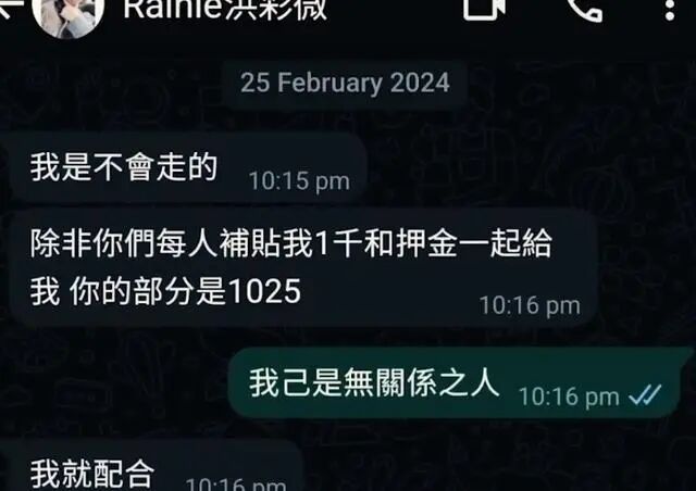 而洪彩微则将房东的电话号码拉黑,拒绝与任何人沟通,并表示如果房客们不想自己搬走的话,就得每人赔偿给她一千澳元,而房东则需退还652澳元的押金。