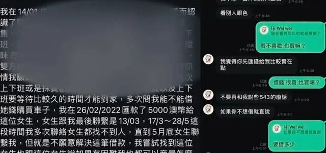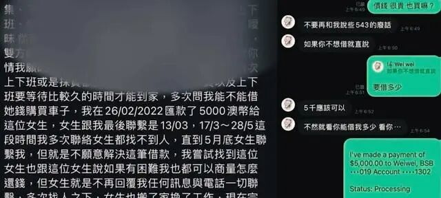 2月26日,洪彩微向他借了5000澳元购买了一辆丰田车后,便将他的电话号码拉黑,不再回复他的信息。