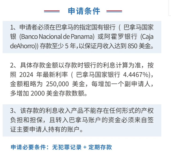 1、申请者必须在巴拿马的指定国有银行(巴拿马国家银(Banco Nacional de Panama)或阿霍罗银行(Caja deAhorro))存款至少5年,以保证月收入达到850美金。