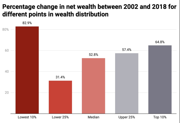 在2002年至2018年间,最贫困的10%家庭的财富增长了83%,尽管起点非常低。