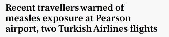 据悉,此次是因为多伦多皮尔逊机场及土耳其航空公司的两架飞机出现了麻疹病例,全部有可能接触到病毒的旅客,都需要自我检测观察。