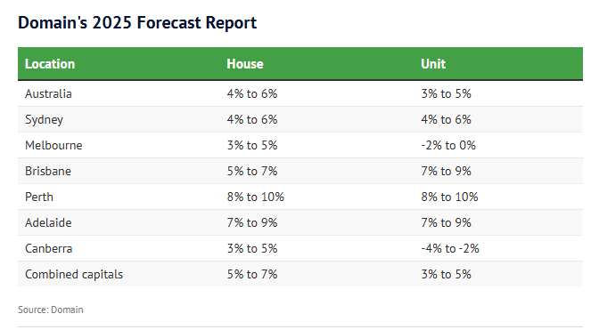 根据 Domain 的 2025 年预测报告,全澳平均房价预计明年将上涨 4% 至 6%。