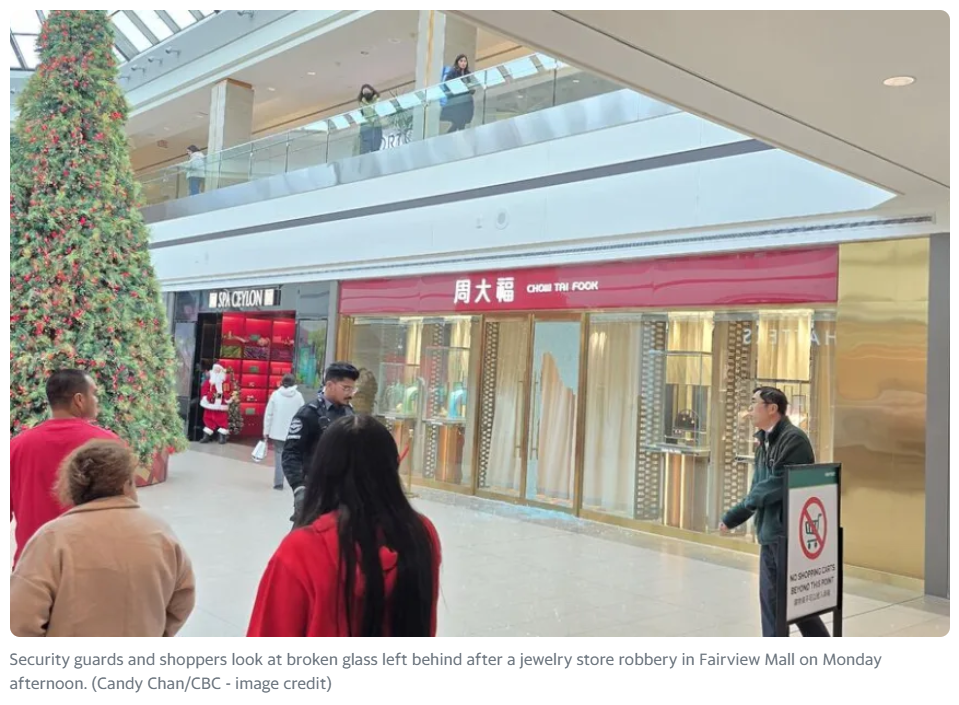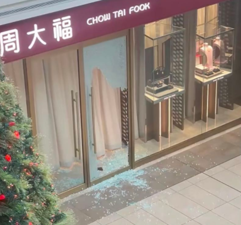 加西周末 2024-12-17 10:47 就在今天周一下午,多伦多北约克的Fairview Mall商场内,发生了一起令人震惊的抢劫事件——中国知名珠宝品牌周大福的店铺被数名劫匪砸窗抢劫。