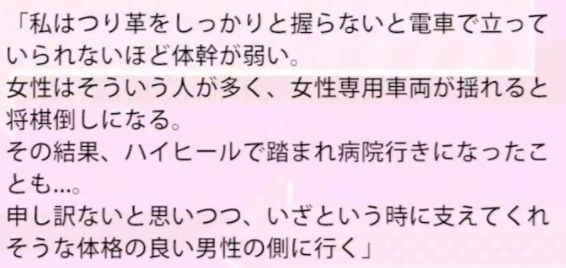 下面这位女性乘坐女性专用车辆就产生了阴影。她说自己因为身体瘦弱,每次坐电车都会紧紧地握着拉环。但有一次乘坐女性专用车厢的时候因为电车突然摇晃所以一车厢的女性都像棋子一样“侧倒”了。好巧不巧的被旁边一位穿高跟鞋的大姐踩了一脚直接进了医院。