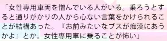 按理说这样的规定应该很受女性的欢迎,然而,日本女性之间形成一股不想搭乘女性专用车辆的风气,因为没有男人需要顾虑,许多没品的人就会开始喷香水、补妆,搞得车内刺鼻味夹杂形成难闻的臭味,加上争执位置的情形远比一般车辆来得夸张,甚至有人将这里形容成「战场」,比跟男人搭车难过好几倍!