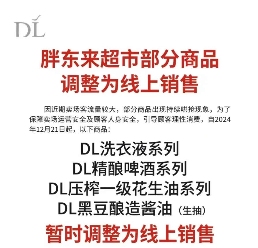 公告内容显示,因近期胖东来卖场客流量较大,部分商品出现持续哄抢现象,为了保障卖场运营安全及顾客人身安全,引导顾客理性消费,自2024年12月21日起,DL洗衣液系列、DL精酿啤酒系列、DL压榨一级花生油系列、DL黑豆酿造酱油(生抽)暂时调整为线上销售。