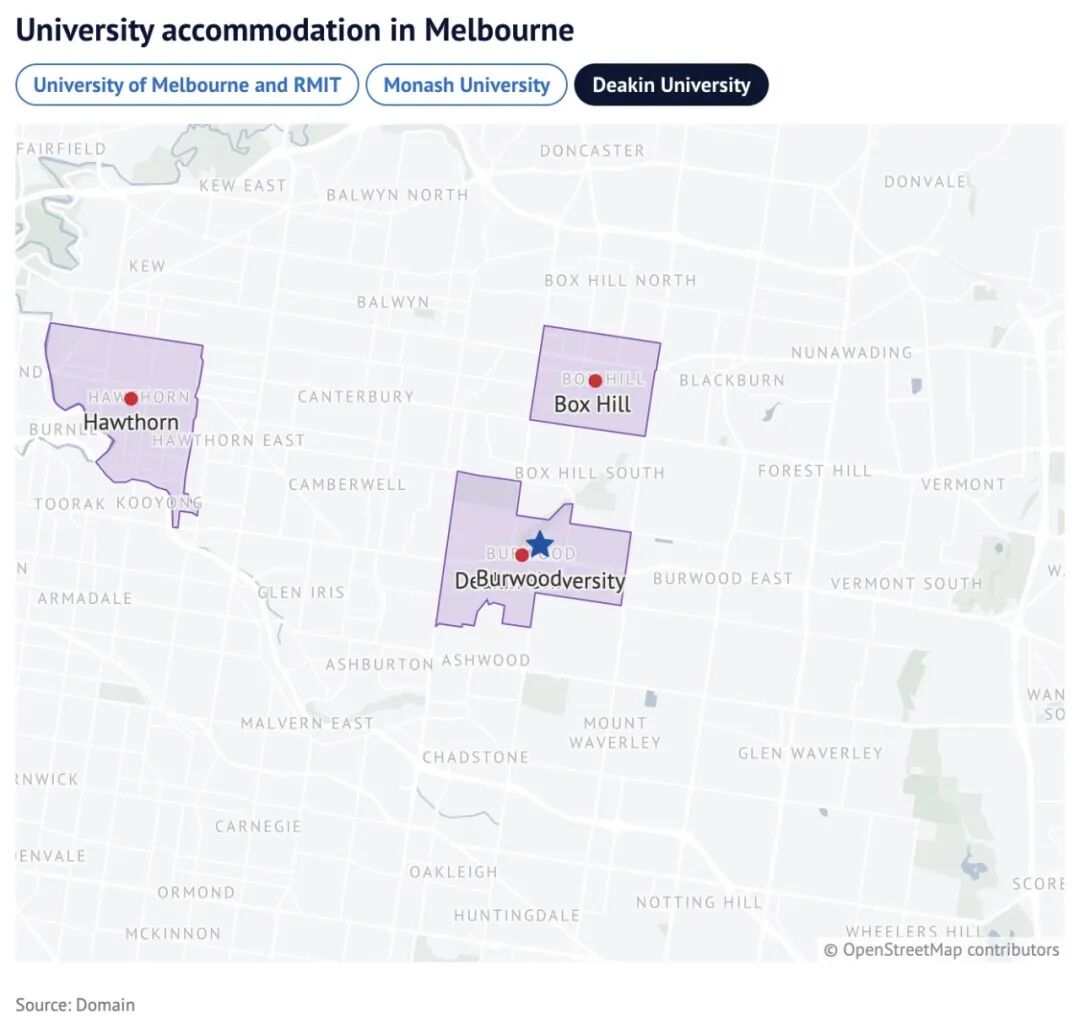 校园外也有不少优质的选择,比如迪肯大学所在的Burwood(房屋中位租金每周630澳元,公寓为390澳元)、墨尔本华人宇宙的中心Box Hill(房屋为560澳元,公寓为500澳元),或是Hawthorn(房屋为750澳元,公寓为450澳元)等。