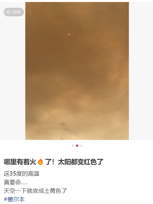 期间,多名墨尔本华人分享了自己看到的奇怪景象:土黄色的天空、火红色的太阳,吓人又诡异!