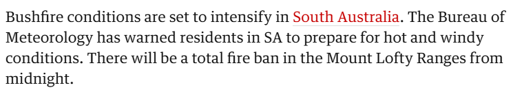 预计在圣诞节后,阿德莱德气温会降至33℃,但Flinders、Mid North、Mount Lofty Ranges、Riverland、Murraylands、Upper South East和Lower South East等地区的极端火灾危险评级不会降低。