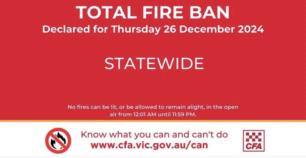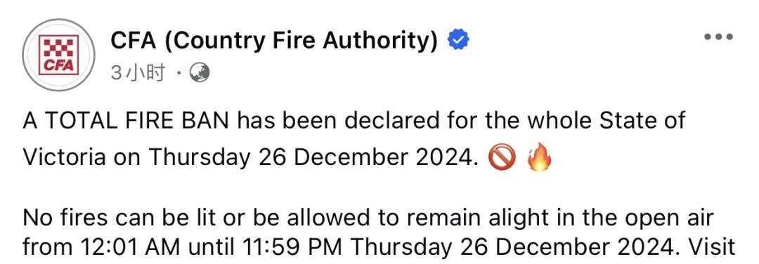 丛林和灌木丛都非常干燥,火灾随时可能发生,尤其是本周四(维州大部分地区气温将超过40℃),请遵守全面禁火令的严格规定,了解火灾风险,并确保您的火灾应急计划涵盖所有可能会发生的情况。”