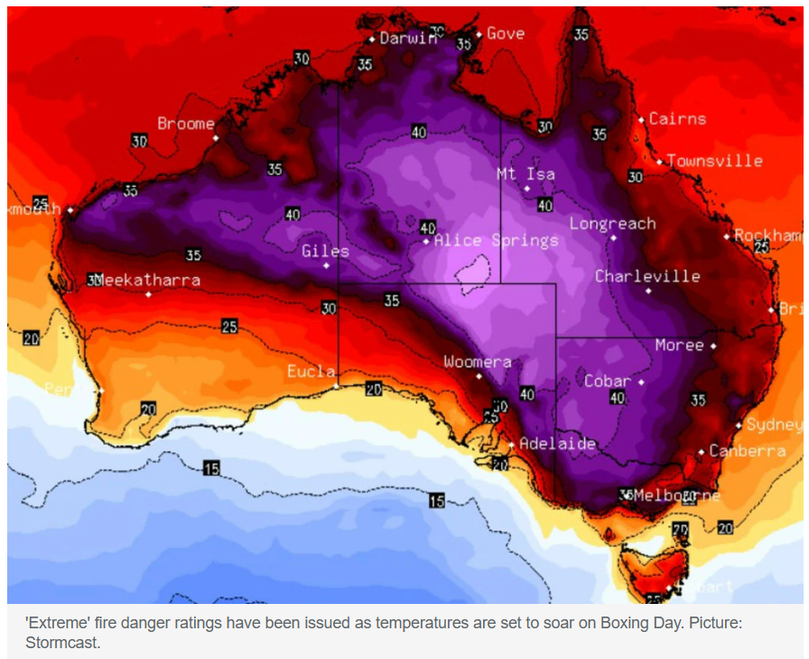 除了新州和维州,南澳也将经历一波热浪,圣诞节当天预计气温达到37℃,West Coast、Lower Eyre Peninsula、Mount Lofty Ranges 和 Yorke Peninsula 已发布极端火灾危险警告。