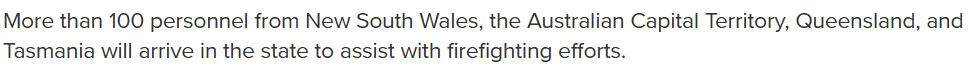 来自新州、澳大利亚首都地区、昆州和塔斯马尼亚的100多名人员将抵达维州——这些支援力量包括两个事件管理团队(IMTs)和四个专业灭火小组。
