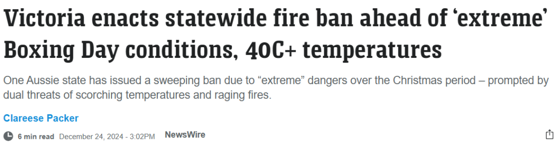 预计维州的火灾危险级别将在圣诞节当天上升,并在12月26日达到“极端”级别。