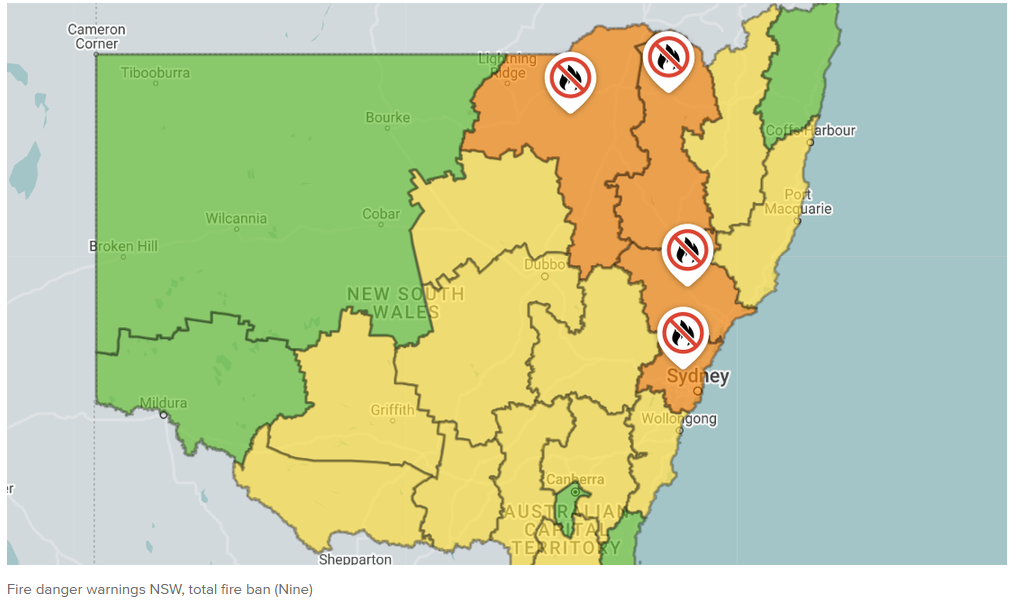 在新州全境有26处灌木林被列为建议警戒级别,而除了上述地区外,还有其他地区也发布了高到中等火险警告。