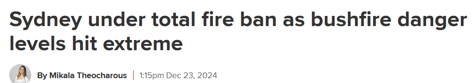 昨天,包括悉尼在内的新州多地实施了全面禁火令。气象局警告称,新州正面临着极端山火危险!