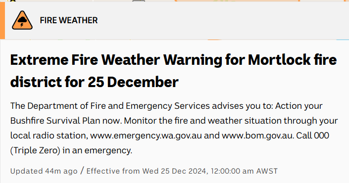 在西澳,当局已发布Mortlock地区明天的极端火灾危险警告。