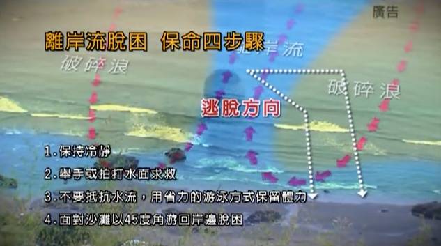 如果不幸被卷入,也别胡乱抵抗耗费体力,应及时呼救并面对沙滩以45度角游回岸边。