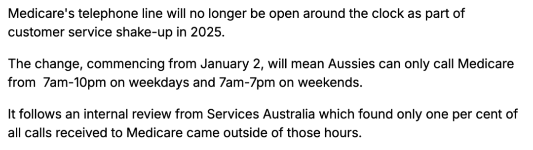 此次调整旨在优化资源配置,更高效地满足Medicare用户的需求,同时缓解长时间等待带来的压力。对于习惯在非工作时间联系Medicare的用户来说,在线服务仍然提供了全天候支持。这一改变标志着澳大利亚在公共服务交付方式上的重要转变,旨在为更多客户提供更优质的体验。