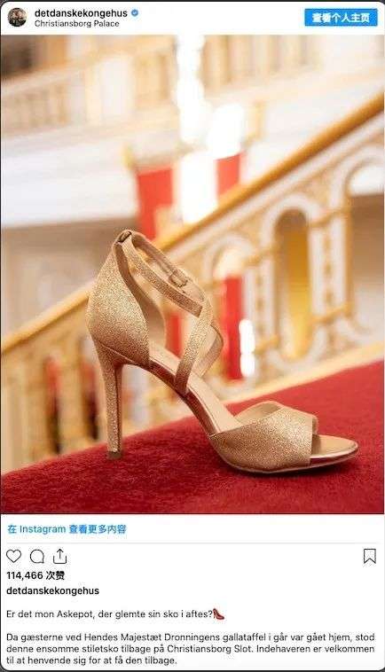 奥尔森就这样如愿留下了那只金色高跟鞋,第二天,丹麦王室的官方社媒官号发出一张配图Po文: