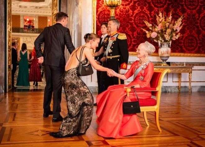 她依次向丹麦女王玛格丽特二世,王储夫妇,以及晚宴的寿星克里斯蒂安王子行了礼。