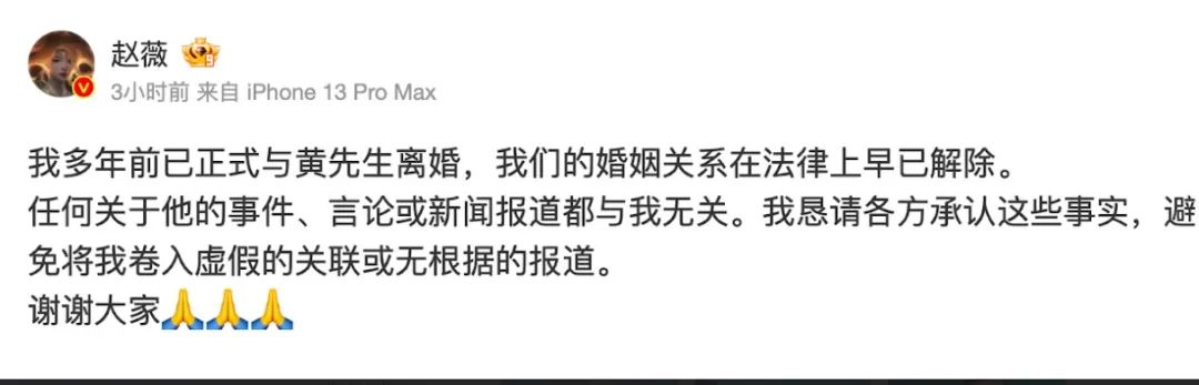 12月28日,48岁的赵薇在微博发声明,宣布和结婚16年的富