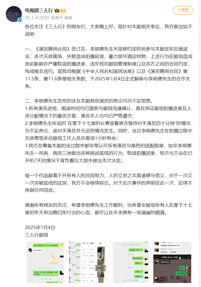 声明中还称,《演员聘用合同》签订后,李明德未按照约定时间参与本剧定妆及围读会,多次无故离场、失联造成拍摄延误、暴力损坏酒店财物,上述行为在剧组造成恶劣影响并严重耽误拍摄进度,违反剧组管理制度以及双方之间的合同约定,构成根本违约。已于2025年1月4日正式解除与李明德的合作关系。