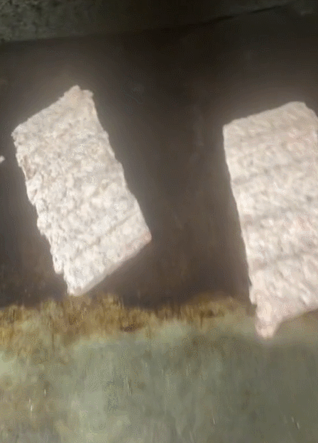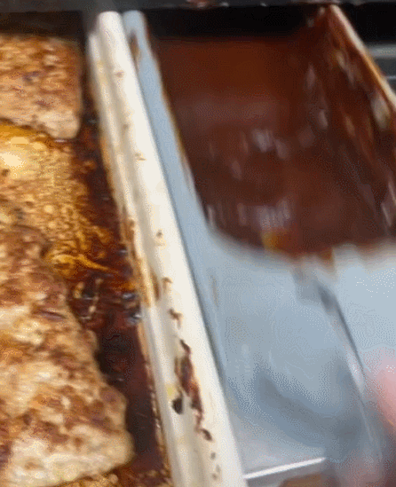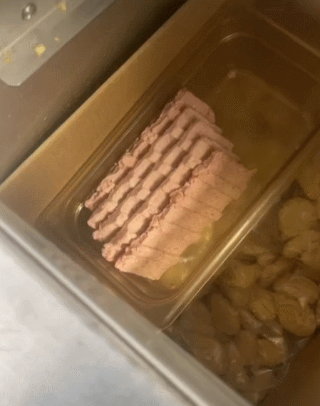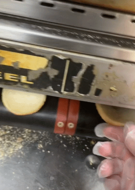 接着,把这两块冻肉饼,放在了黑乎乎油腻腻的机器上↓