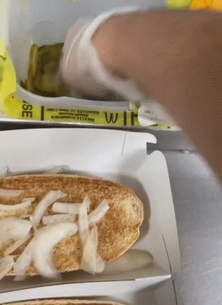 然后,再从纸盒里给你抓些腌黄瓜和洋葱……