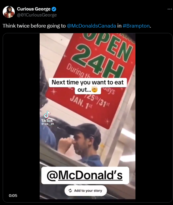 有网友@01CuriousGeorge在社交媒体X上发布了一段视频,配文“去Brampton的麦当劳之前请三思!”