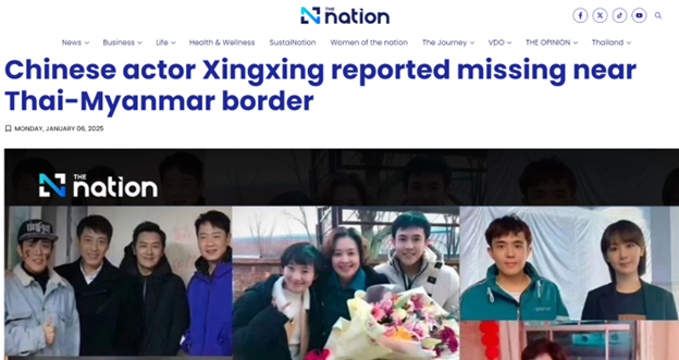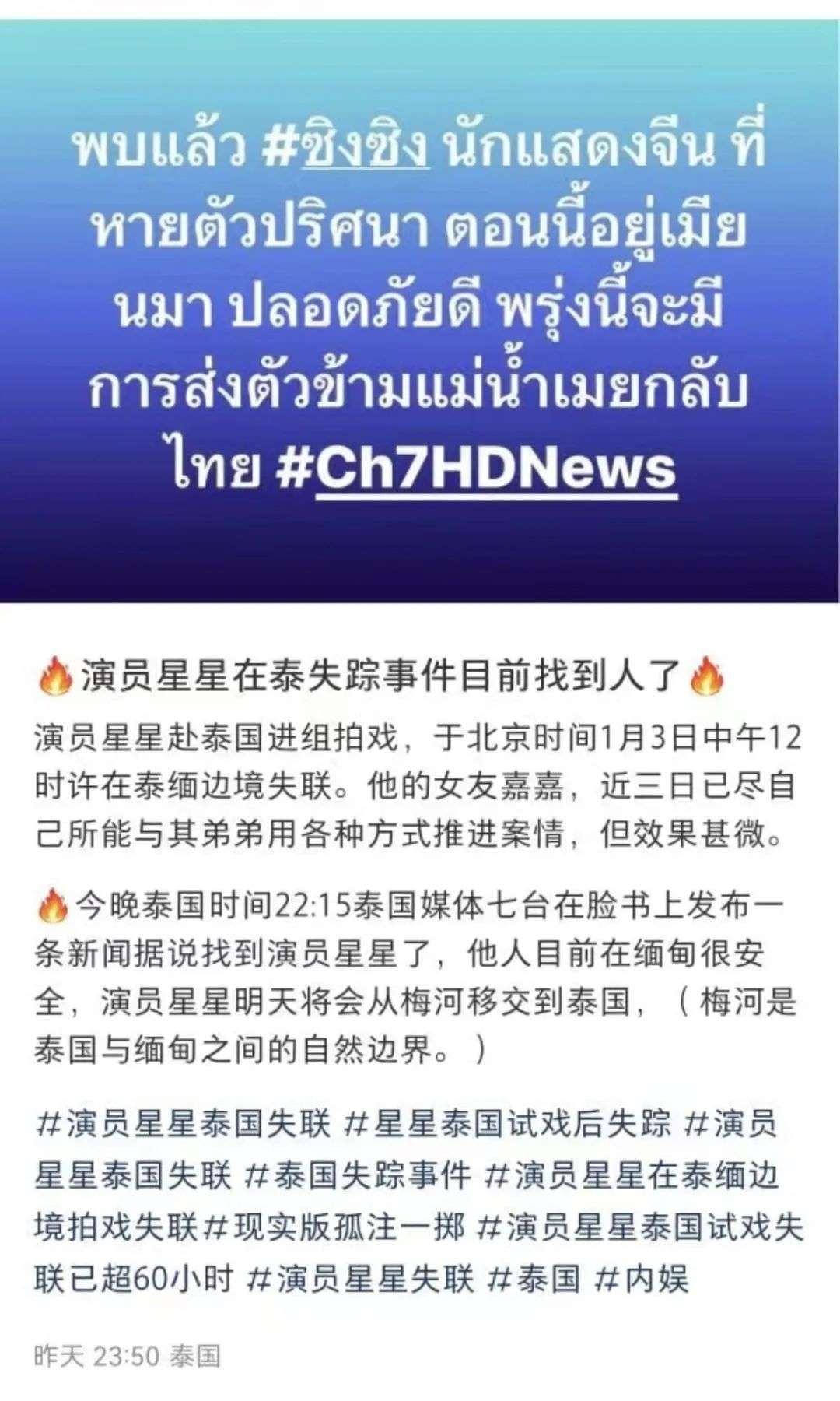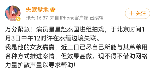 “万分紧急!演员星星赴泰国进组拍戏,于北京时间1月3日中午12时许在泰缅边境失联。