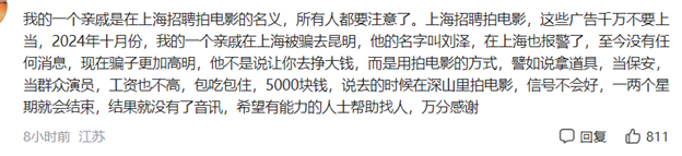 上海招聘拍电影,这些广告千万不要上当,2024年十月份,我的一个亲戚在上海被骗去昆明,他的名字叫刘泽。