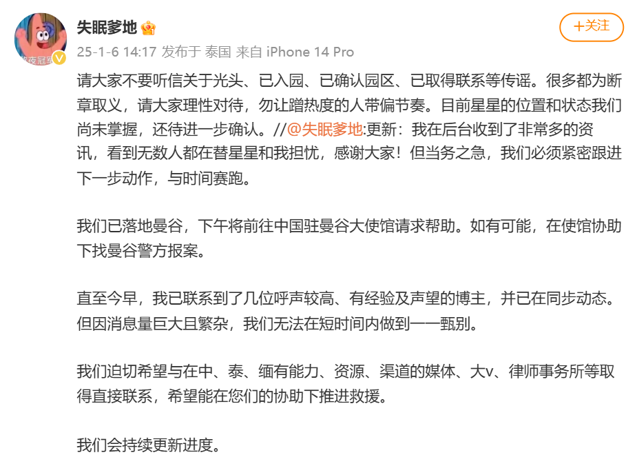 直至今早,星星女友已联系到了几位呼声较高、有经验及声望的博主,并已在同步动态。星星女友及博主们希望与在中、泰、缅有能力、资源、渠道的媒体、大v、律师事务所等取得直接联系,希望能在他们的协助下推进救援。