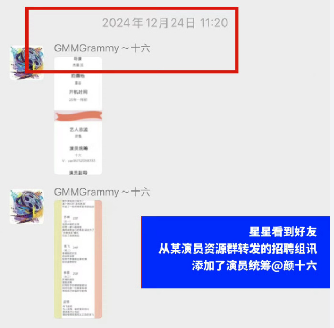 去年12月24日,王星在某演员接戏群收到组讯,在一个名叫“颜十六”的所谓副导演的引导下,决定前往泰国进组。