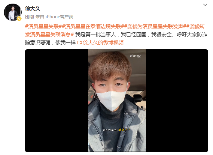 1月6日,演员徐大久发布视频称,自己是第二批当事人(王星是第三批),刚从人贩子手中跑出来,目前已经回国。