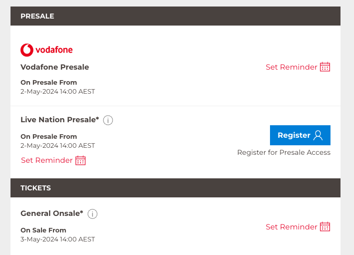 除此之外,Live Nation,Frontier Touring和Vodafone的预售将于5月2日周四开始。