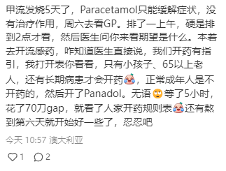 还有人表示如果感染了甲流会更恐怖,不是一天两天就能好转的。比如说这位网友已经甲流感染第五天,用了Paracetmol也只能缓解症状,没有任何治疗作用。